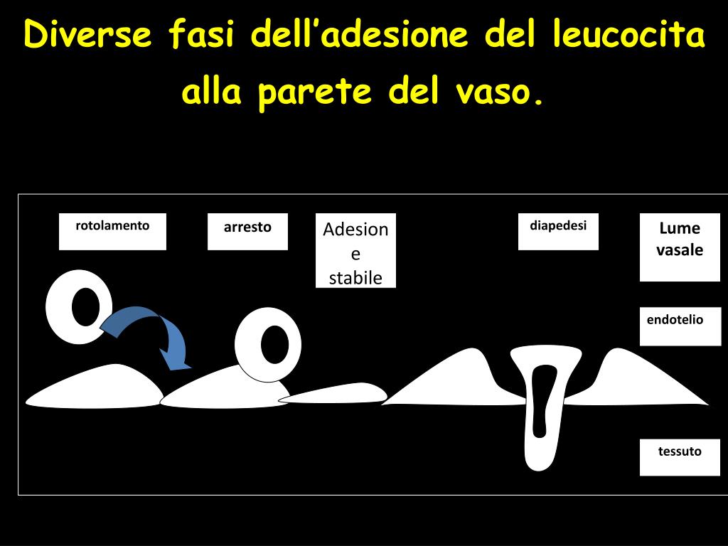 Il processo che porta alla fuoriuscita dei vasi dei leucociti è chiamato EXTRAVASAZIONE e si verifica in 4 fasi. • Legame reversibile del leucocita all’epitelio vascolare (rotolamento). • Stadio di ARRESTO dove il leucocita è legato all’endotelio in modo irreversibile • Stadio di ADESIONE STABILE in cui il leucocita è saldamente ancorato e il rotolamento è bloccato • DIAPEDESI in cui il leucocita extravasa ossia attraversa la parete endoteliale.