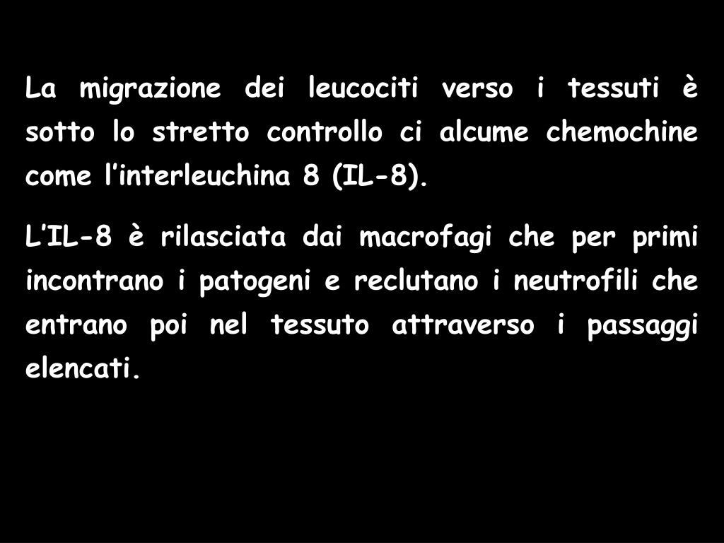 La migrazione dei leucociti verso i tessuti è sotto lo stretto controllo ci alcume chemochine come l’interleuchina 8 (IL-8). L’IL-8 è rilasciata dai macrofagi che per primi incontrano i patogeni e reclutano i neutrofili che entrano poi nel tessuto attraverso i passaggi elencati.