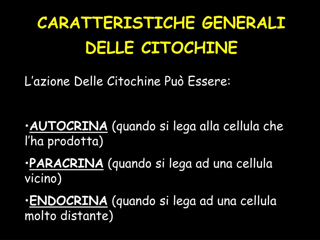 CARATTERISTICHE GENERALI DELLE CITOCHINE • L’azione Delle Citochine Può Essere: • AUTOCRINA (quando si lega alla cellula che l’ha prodotta) • PARACRINA (quando si lega ad una cellula vicino) • ENDOCRINA (quando si lega ad una cellula molto distante)