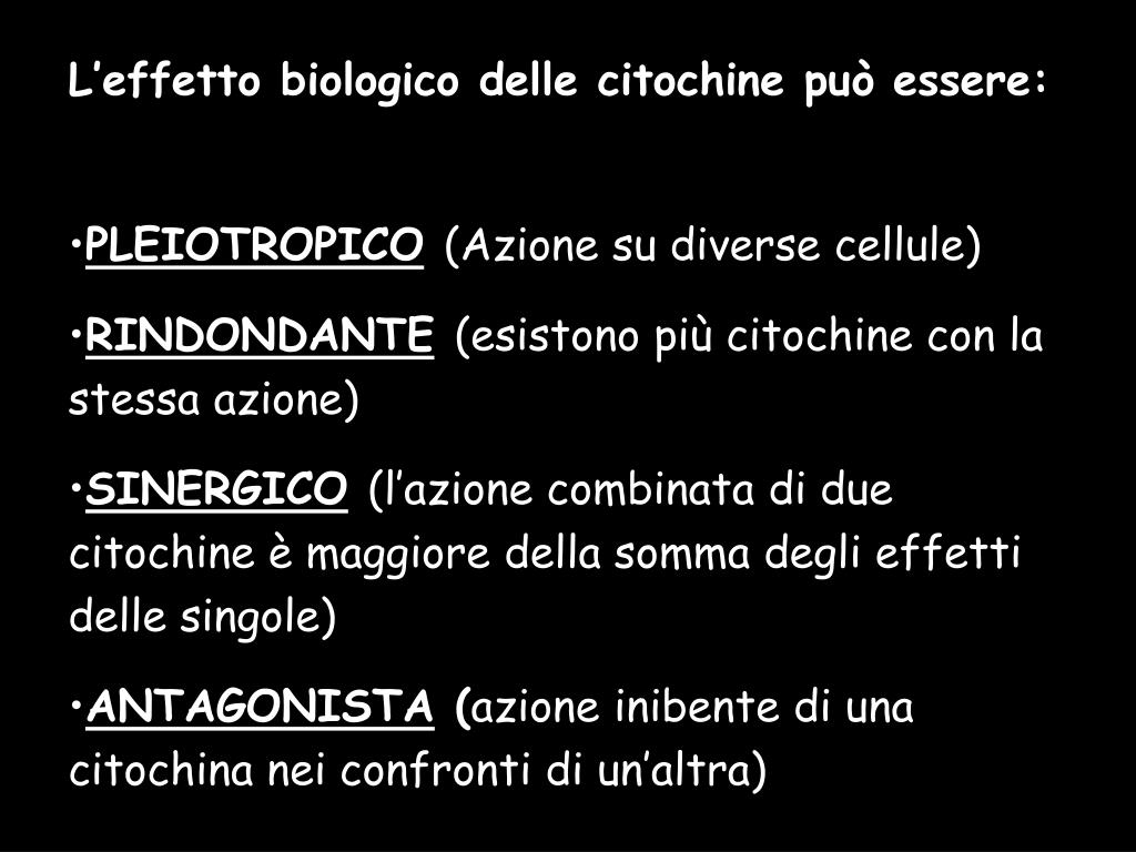 L’effetto biologico delle citochine può essere: • PLEIOTROPICO(Azione su diverse cellule) • RINDONDANTE(esistono più citochine con la stessa azione) • SINERGICO(l’azione combinata di due citochine è maggiore della somma degli effetti delle singole) • ANTAGONISTA (azione inibente di una citochina nei confronti di un’altra)