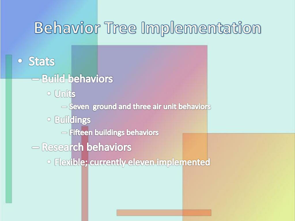 Behavior Tree Implementation • Stats • Build behaviors • Units • Seven ground and three air unit behaviors • Buildings • Fifteen buildings behaviors • Research behaviors • Flexible; currently eleven implemented