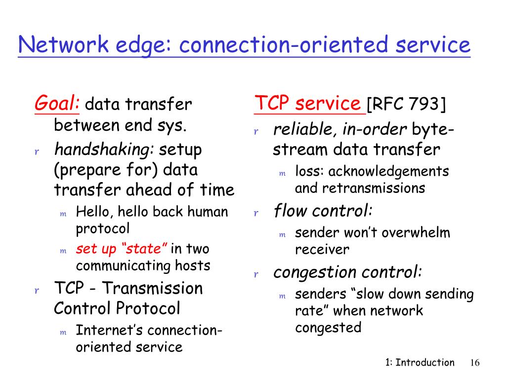 Goal: data transfer between end sys. handshaking: setup (prepare for) data transfer ahead of time Hello, hello back human protocol set up “state” in two communicating hosts TCP - Transmission Control Protocol Internet’s connection-oriented service TCP service[RFC 793] reliable, in-order byte-stream data transfer loss: acknowledgements and retransmissions flow control: sender won’t overwhelm receiver congestion control: senders “slow down sending rate” when network congested Network edge: connection-oriented service 1: Introduction