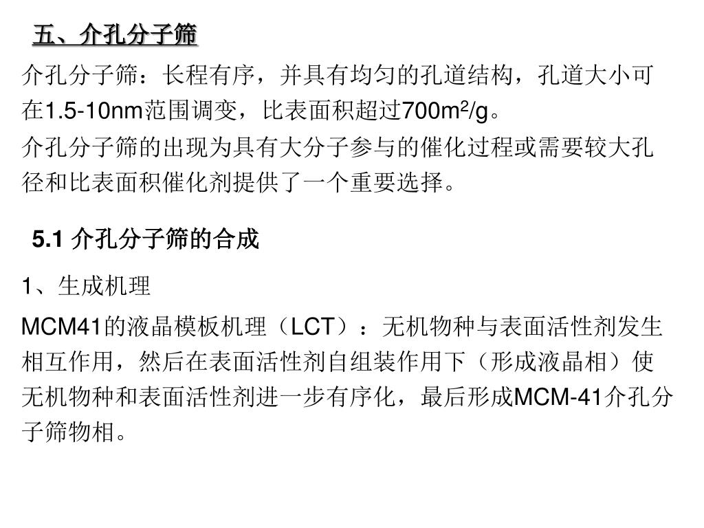 五、介孔分子筛 介孔分子筛:长程有序,并具有均匀的孔道结构,孔道大小可在1.5-10nm范围调变,比表面积超过700m2/g。 介孔分子筛的出现为具有大分子参与的催化过程或需要较大孔径和比表面积催化剂提供了一个重要选择。 5.1 介孔分子筛的合成 1、生成机理 MCM41的液晶模板机理(LCT):无机物种与表面活性剂发生相互作用,然后在表面活性剂自组装作用下(形成液晶相)使无机物种和表面活性剂进一步有序化,最后形成MCM-41介孔分子筛物相。