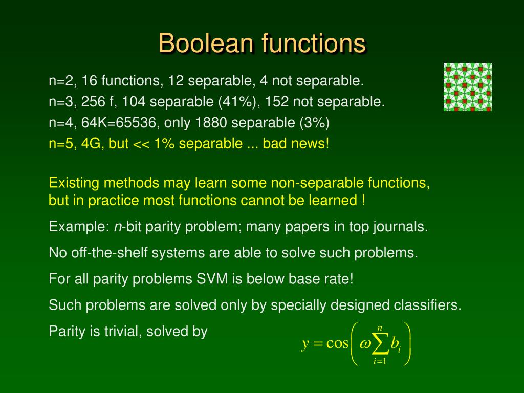 Boolean functions n=2, 16 functions, 12 separable, 4 not separable. n=3, 256 f, 104 separable (41%), 152 not separable. n=4, 64K=65536, only 1880 separable (3%) n=5, 4G, but << 1% separable ... bad news! Existing methods may learn some non-separable functions, but in practice most functions cannot be learned ! Example: n-bit parity problem; many papers in top journals. No off-the-shelf systems are able to solve such problems. For all parity problems SVM is below base rate! Such problems are solved only by specially designed classifiers. Parity is trivial, solved by