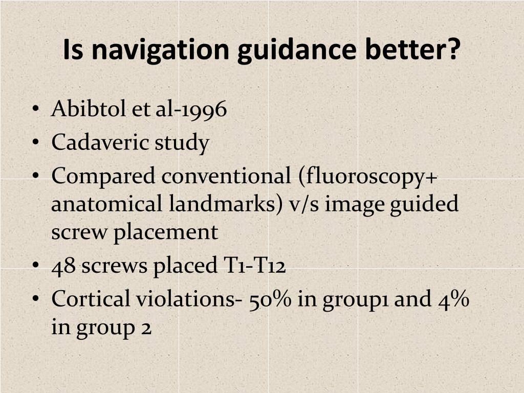 Is navigation guidance better? • Abibtol et al-1996 • Cadaveric study • Compared conventional (fluoroscopy+ anatomical landmarks) v/s image guided screw placement • 48 screws placed T1-T12 • Cortical violations- 50% in group1 and 4% in group 2