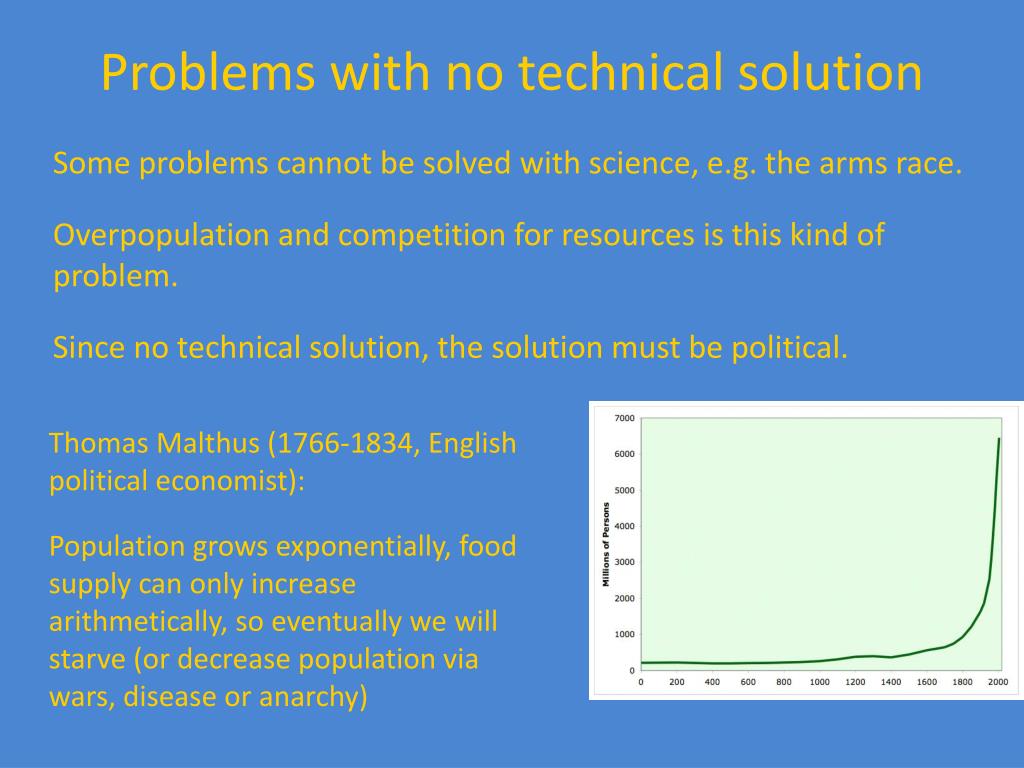 Problems with no technical solution Some problems cannot be solved with science, e.g. the arms race. Overpopulation and competition for resources is this kind of problem. Since no technical solution, the solution must be political. Thomas Malthus (1766-1834, English political economist): Population grows exponentially, food supply can only increase arithmetically, so eventually we will starve (or decrease population via wars, disease or anarchy)