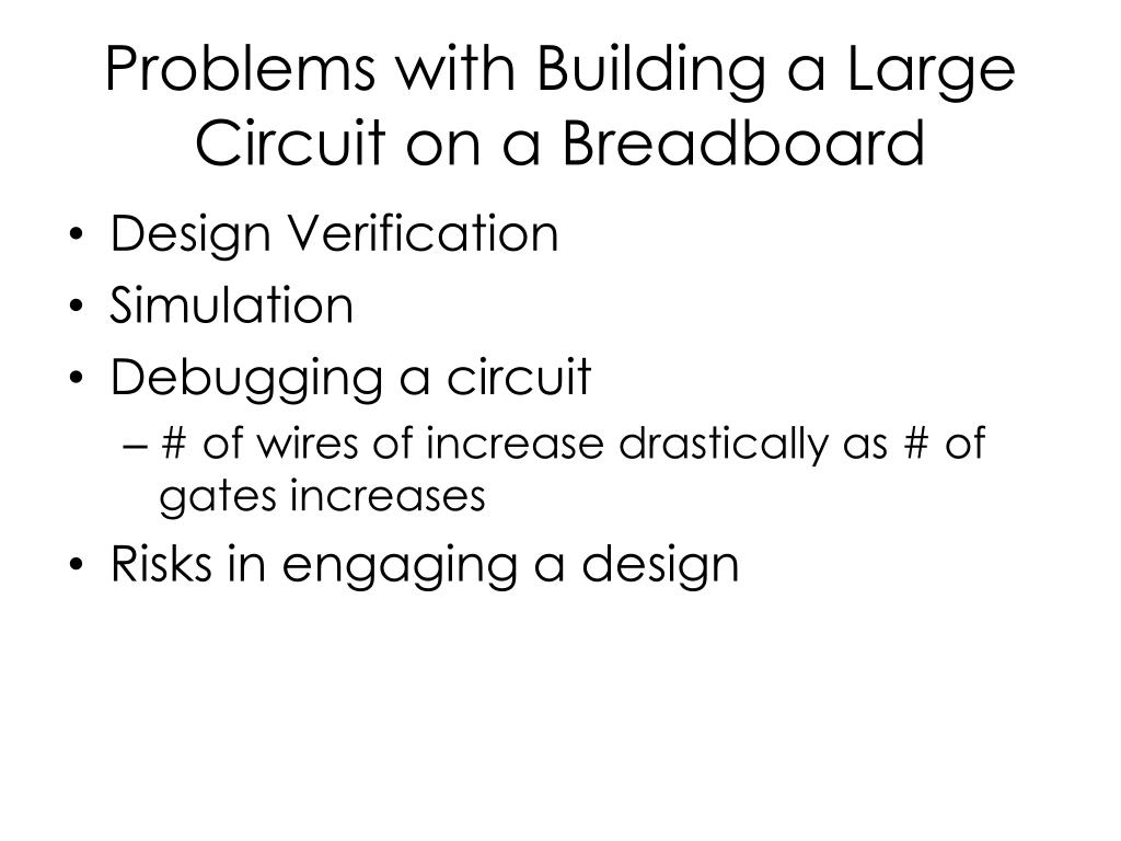 Problems with Building a Large Circuit on a Breadboard • Design Verification • Simulation • Debugging a circuit • # of wires of increase drastically as # of gates increases • Risks in engaging a design