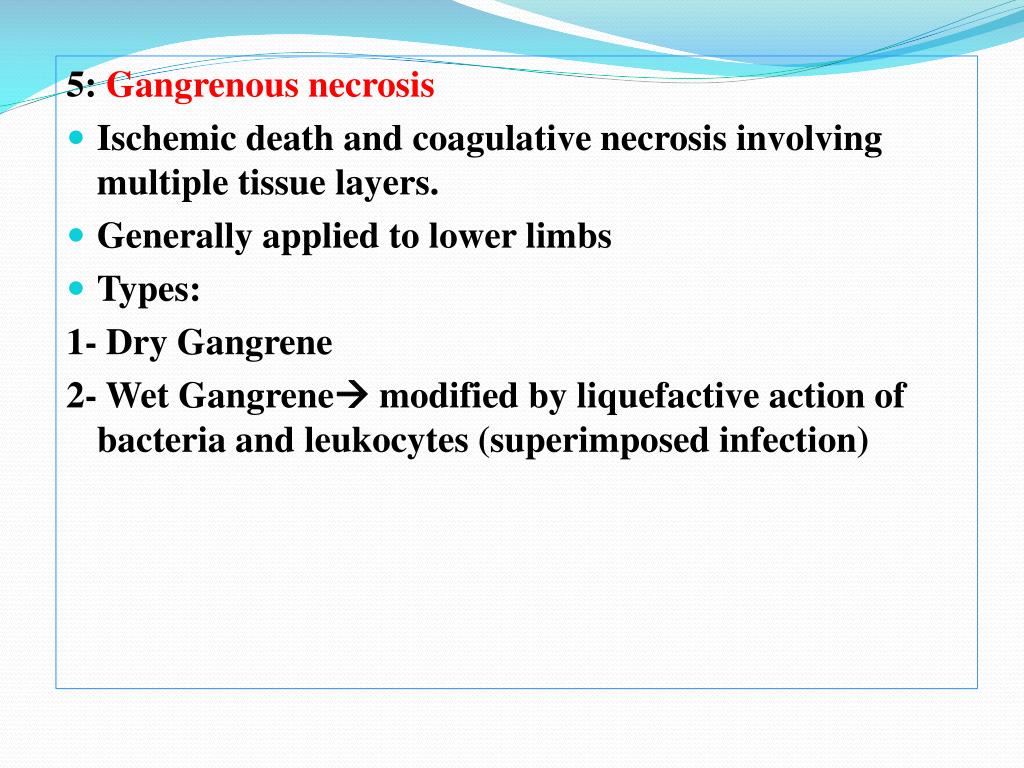5: Gangrenousnecrosis • Ischemic death and coagulative necrosis involving multiple tissue layers. • Generally applied to lower limbs • Types: 1- Dry Gangrene 2- Wet Gangrene modified by liquefactive action of bacteria and leukocytes (superimposed infection)