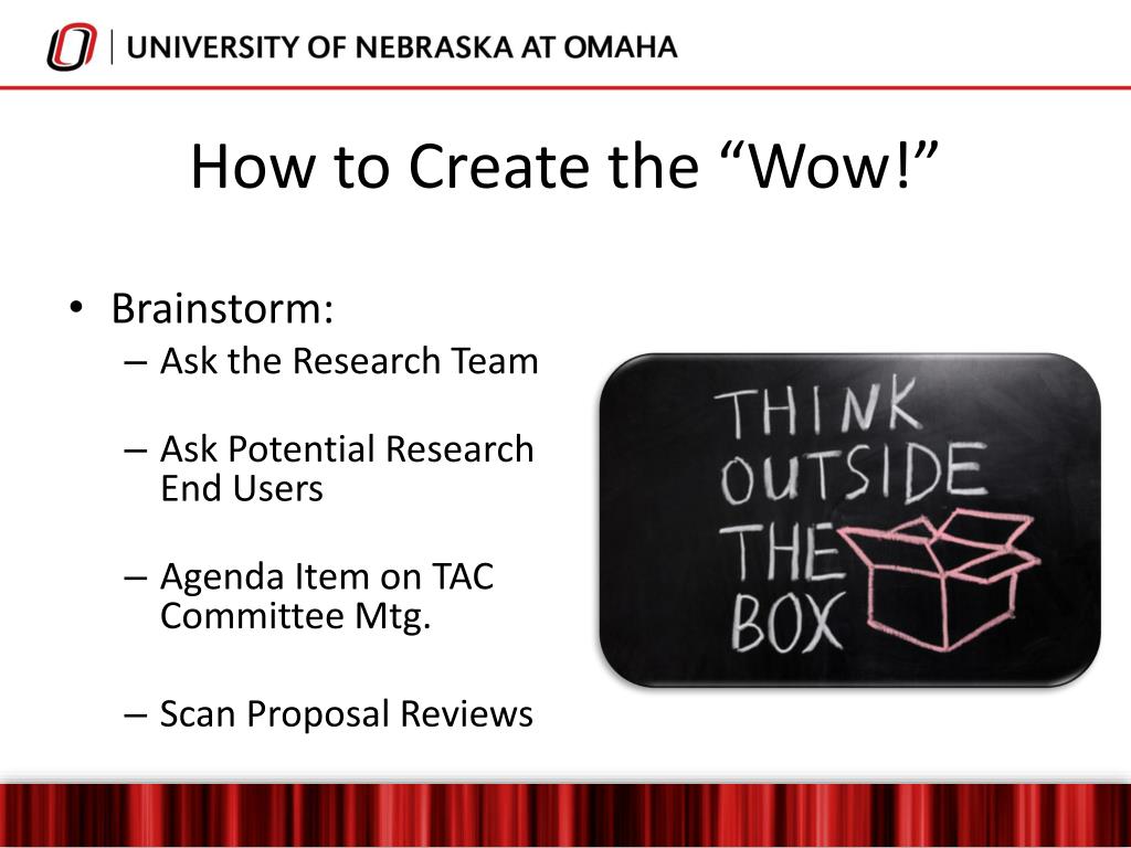 How to Create the “Wow!” • Brainstorm: • Ask the Research Team • Ask Potential Research End Users • Agenda Item on TAC Committee Mtg. • Scan Proposal Reviews