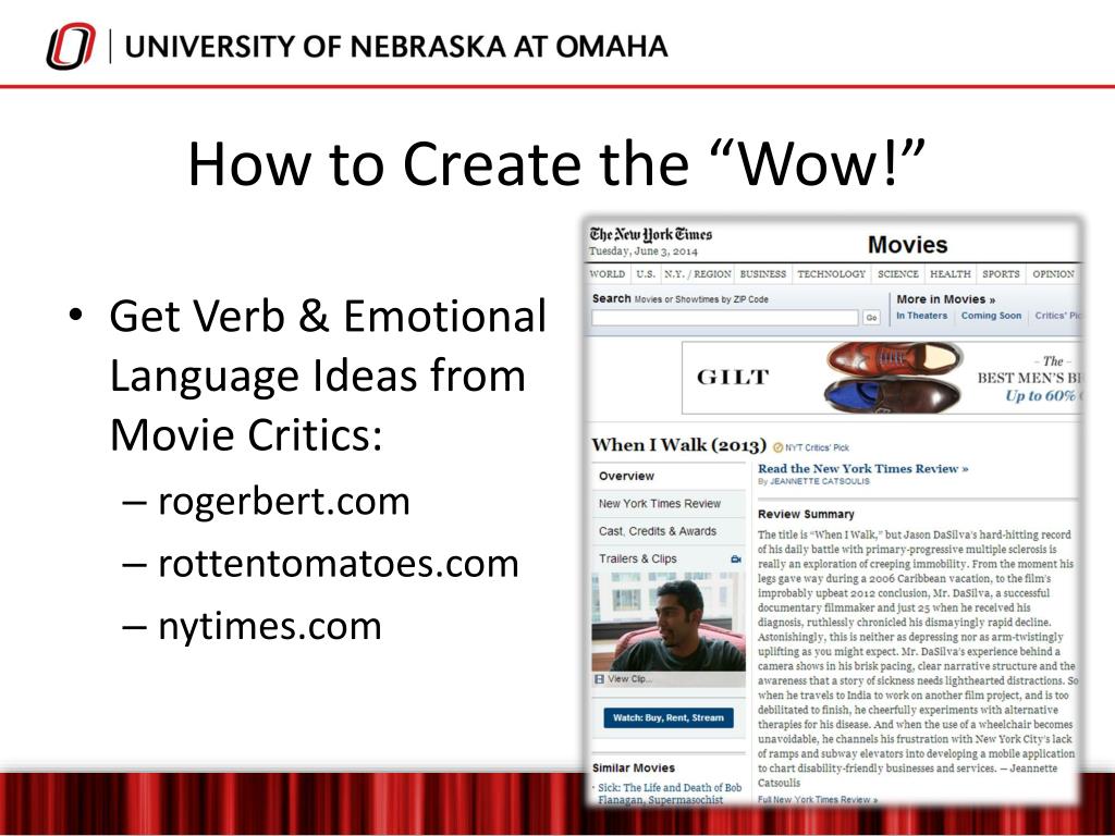 How to Create the “Wow!” • Get Verb & EmotionalLanguage Ideas fromMovie Critics: • rogerbert.com • rottentomatoes.com • nytimes.com