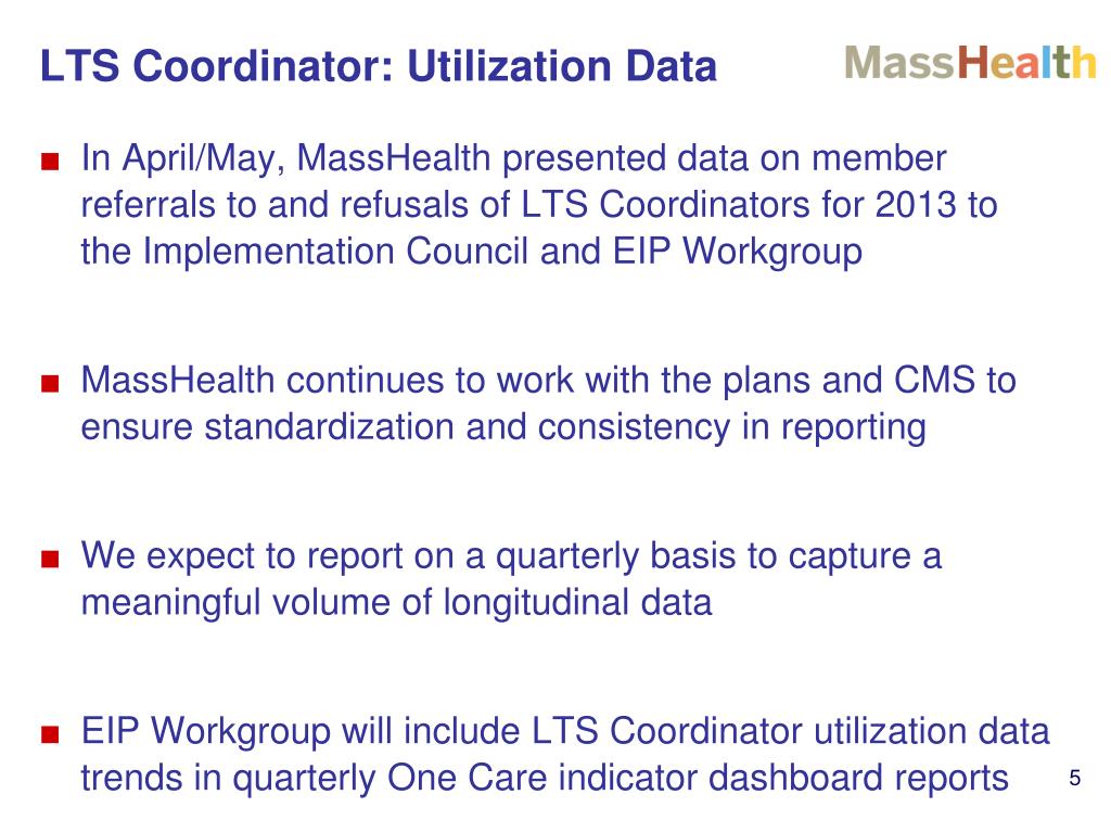 LTS Coordinator: Utilization Data In April/May, MassHealth presented data on member referrals to and refusals of LTS Coordinators for 2013 to the Implementation Council and EIP Workgroup MassHealth continues to work with the plans and CMS to ensure standardization and consistency in reporting We expect to report on a quarterly basis to capture a meaningful volume of longitudinal data EIP Workgroup will include LTS Coordinator utilization data trends in quarterly One Care indicator dashboard reports 5