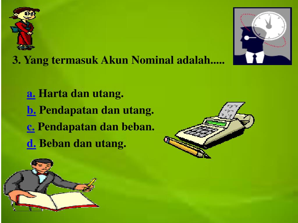 3. Yang termasuk Akun Nominal adalah..... a. Harta dan utang. b. Pendapatan dan utang. c. Pendapatan dan beban. d. Beban dan utang.