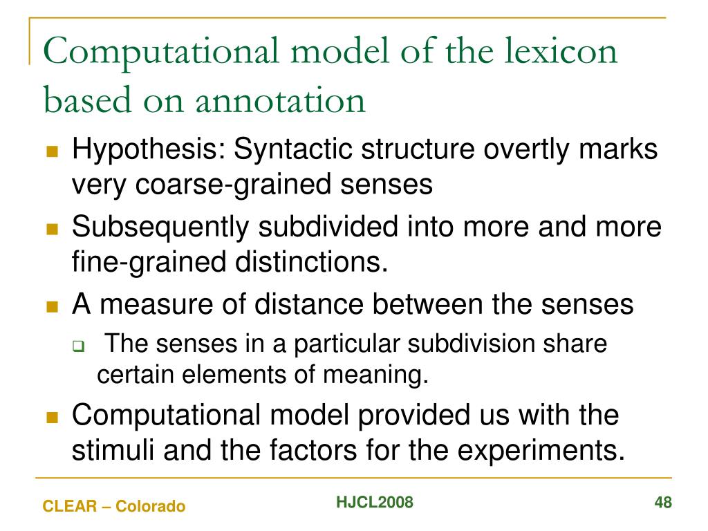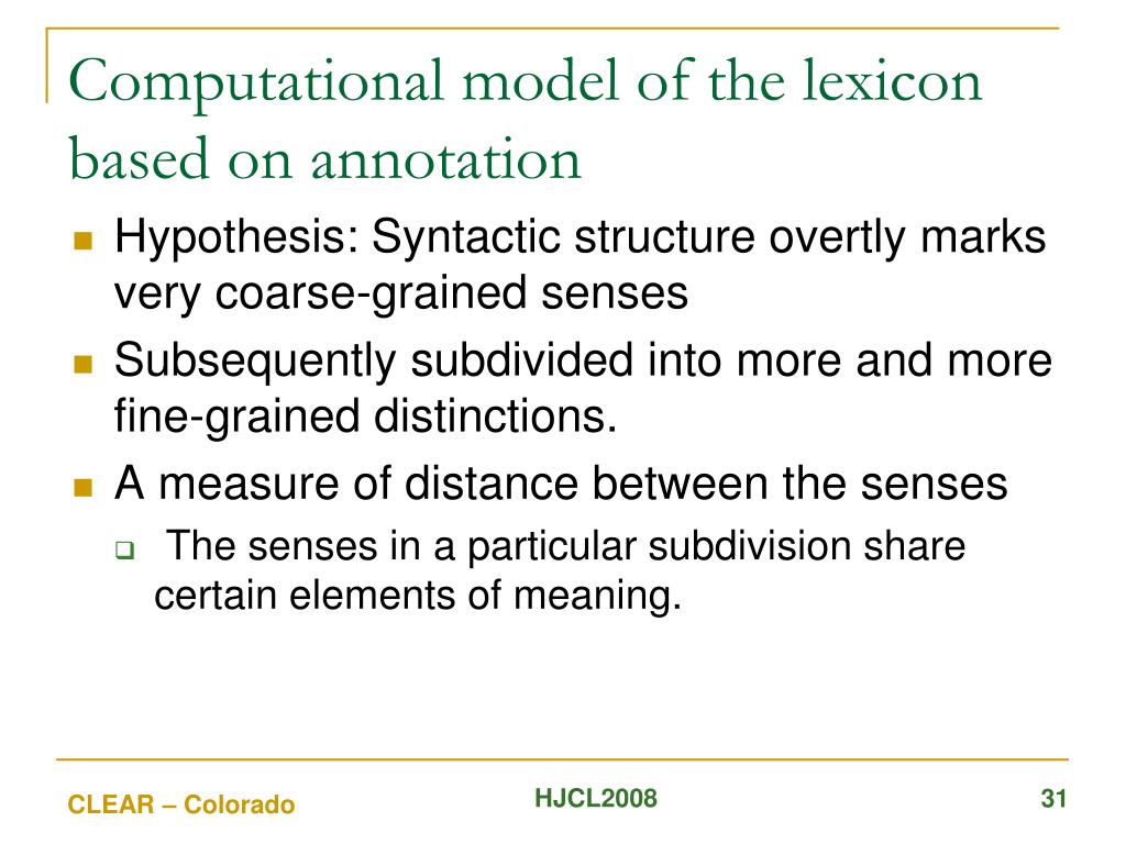Computational model of the lexicon based on annotation • Hypothesis: Syntactic structure overtly marks very coarse-grained senses • Subsequently subdivided into more and more fine-grained distinctions. • A measure of distance between the senses • The senses in a particular subdivision share certain elements of meaning. HJCL2008