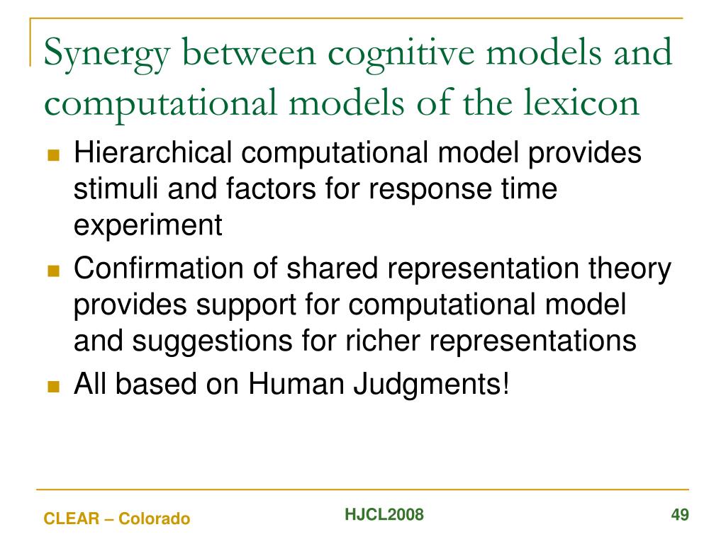 Synergy between cognitive models and computational models of the lexicon • Hierarchical computational model provides stimuli and factors for response time experiment • Confirmation of shared representation theory provides support for computational model and suggestions for richer representations • All based on Human Judgments! HJCL2008