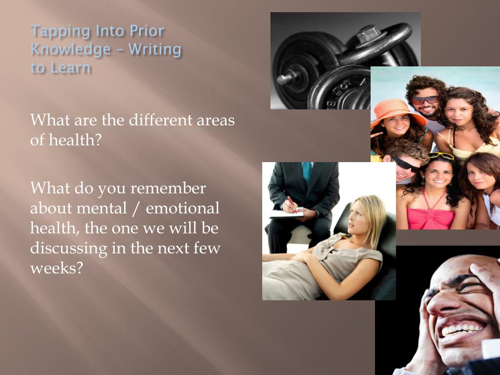 Tapping Into Prior Knowledge – Writing to Learn What are the different areas of health? What do you remember about mental / emotional health, the one we will be discussing in the next few weeks?