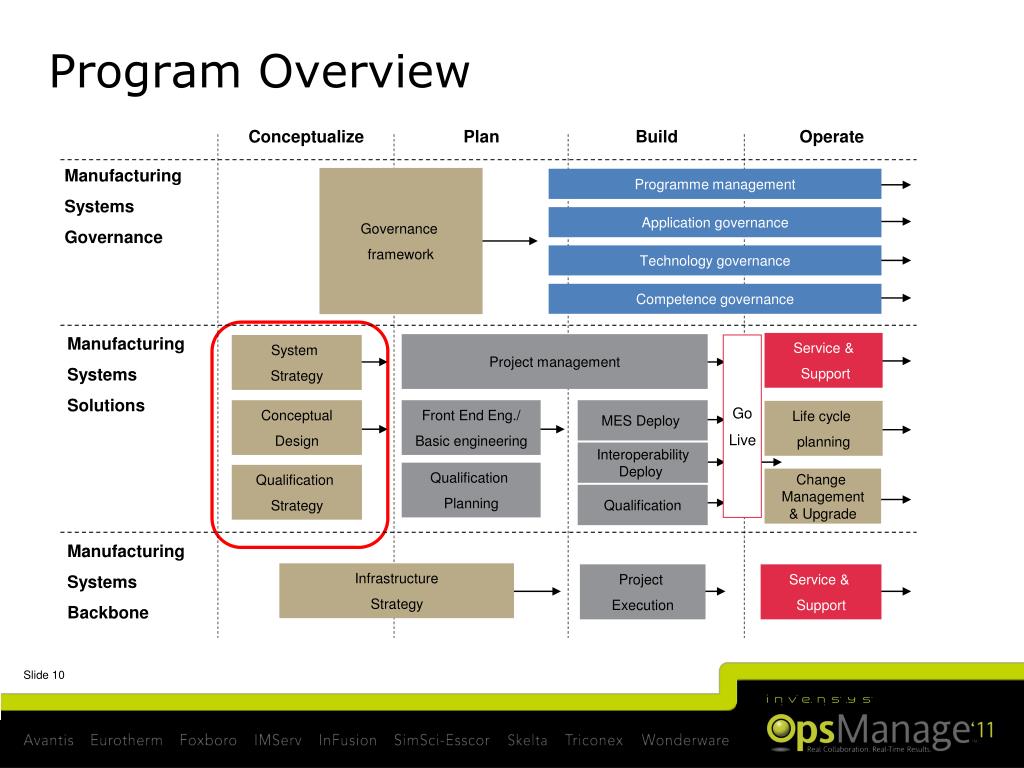 Conceptualize Plan Build Operate Program Overview Manufacturing Systems Governance Governance framework Programme management Application governance Technology governance Competence governance Manufacturing Systems Solutions Service & Support Project management System Strategy Go Live Conceptual Design Front End Eng./ Basic engineering MES Deploy Life cycle planning Interoperability Deploy Qualification Planning Qualification Strategy Change Management & Upgrade Qualification Manufacturing Systems Backbone Infrastructure Strategy Project Execution Service & Support