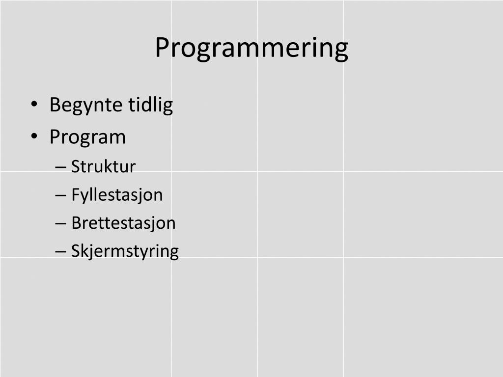 Programmering • Begynte tidlig • Program • Struktur • Fyllestasjon • Brettestasjon • Skjermstyring
