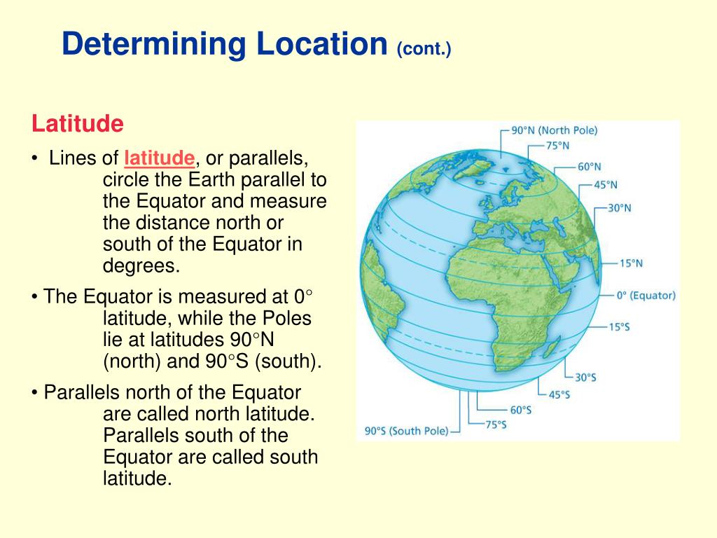 Determining Location (cont.) • Latitude • Lines of latitude, or parallels, circle the Earth parallel to the Equator and measure the distance north or south of the Equator in degrees. • The Equator is measured at 0° latitude, while the Poles lie at latitudes 90°N (north) and 90°S (south). • Parallels north of the Equator are called north latitude. Parallels south of the Equator are called south latitude.