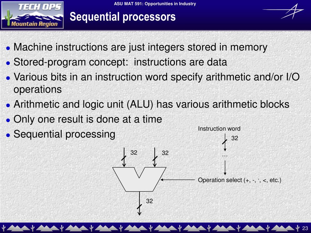 Sequential processors • Machine instructions are just integers stored in memory • Stored-program concept: instructions are data • Various bits in an instruction word specify arithmetic and/or I/O operations • Arithmetic and logic unit (ALU) has various arithmetic blocks • Only one result is done at a time • Sequential processing Instruction word 32 32 32 … Operation select (+, -, ·, <, etc.) 32
