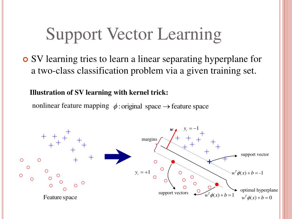 margins support vector optimal hyperplane support vectors Support Vector Learning • SV learning tries to learn a linear separating hyperplane for a two-class classification problem via a given training set. Illustration of SV learning with kernel trick: nonlinear feature mapping