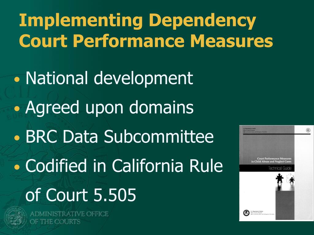 Implementing Dependency Court Performance Measures • National development • Agreed upon domains • BRC Data Subcommittee • Codified in California Rule of Court 5.505