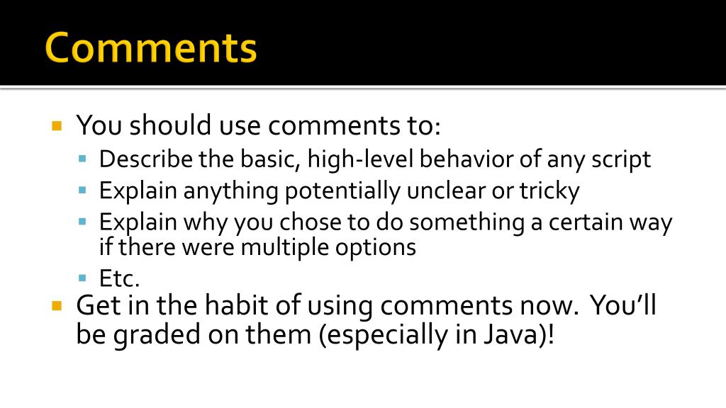 Comments • You should use comments to: • Describe the basic, high-level behavior of any script • Explain anything potentially unclear or tricky • Explain why you chose to do something a certain way if there were multiple options • Etc. • Get in the habit of using comments now. You’ll be graded on them (especially in Java)!