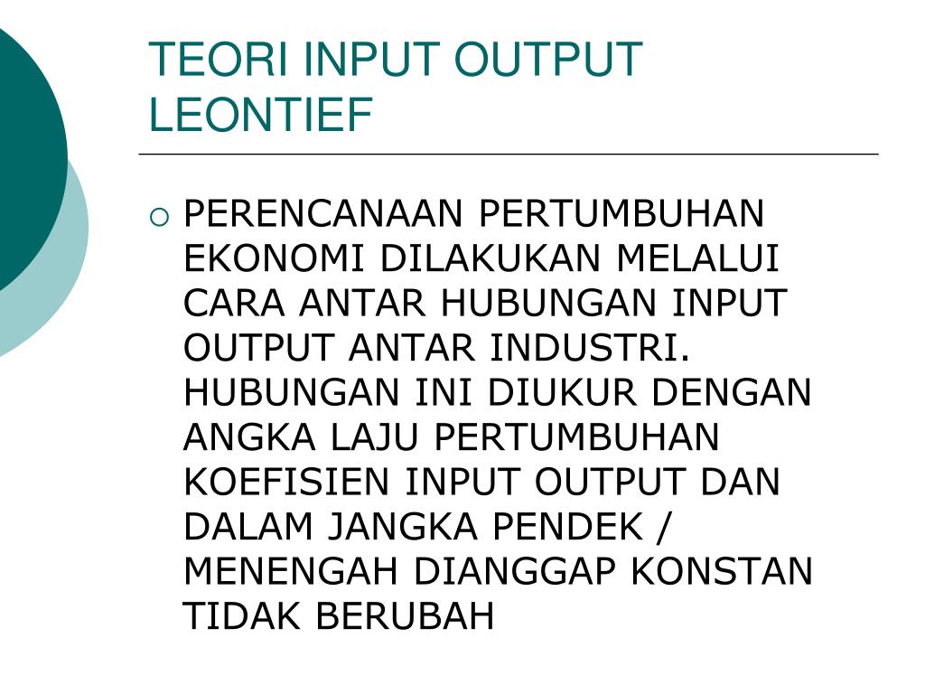 TEORI INPUT OUTPUT LEONTIEF • PERENCANAAN PERTUMBUHAN EKONOMI DILAKUKAN MELALUI CARA ANTAR HUBUNGAN INPUT OUTPUT ANTAR INDUSTRI. HUBUNGAN INI DIUKUR DENGAN ANGKA LAJU PERTUMBUHAN KOEFISIEN INPUT OUTPUT DAN DALAM JANGKA PENDEK / MENENGAH DIANGGAP KONSTAN TIDAK BERUBAH