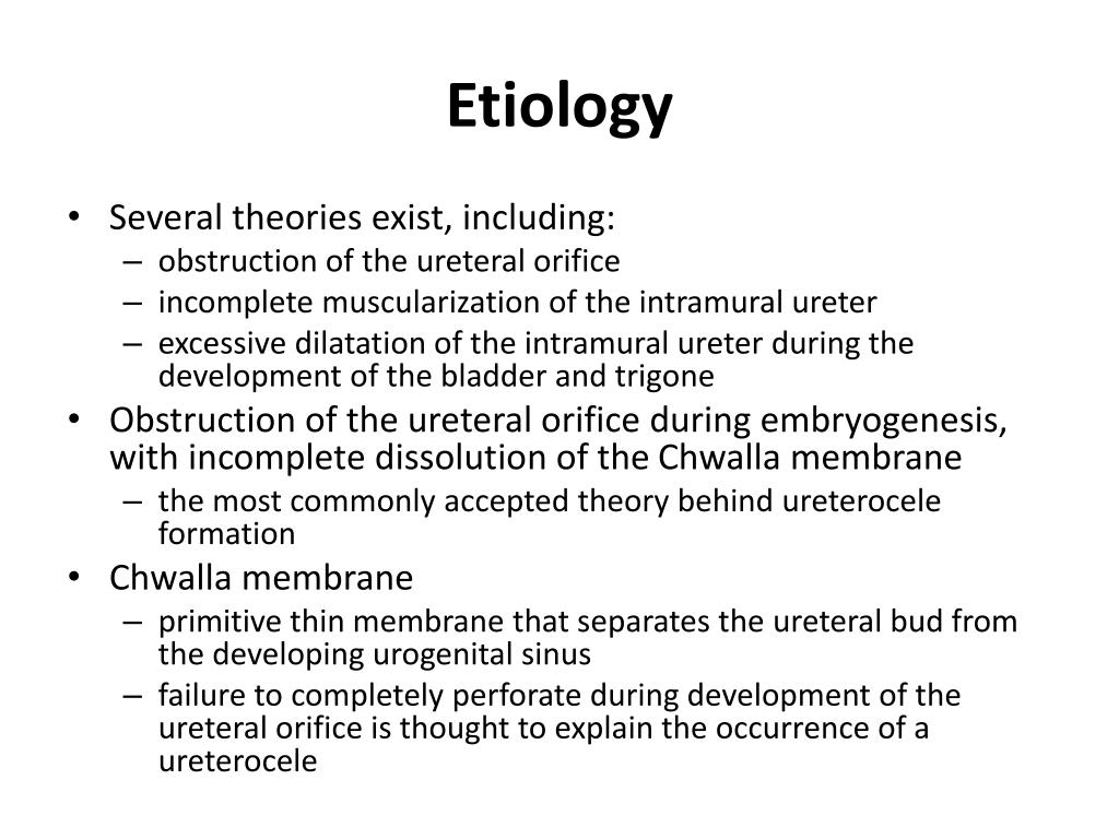 Etiology • Several theories exist, including: • obstruction of the ureteral orifice • incomplete muscularization of the intramural ureter • excessive dilatation of the intramural ureter during the development of the bladder and trigone • Obstruction of the ureteral orifice during embryogenesis, with incomplete dissolution of the Chwalla membrane • the most commonly accepted theory behind ureterocele formation • Chwalla membrane • primitive thin membrane that separates the ureteral bud from the developing urogenital sinus • failure to completely perforate during development of the ureteral orifice is thought to explain the occurrence of a ureterocele