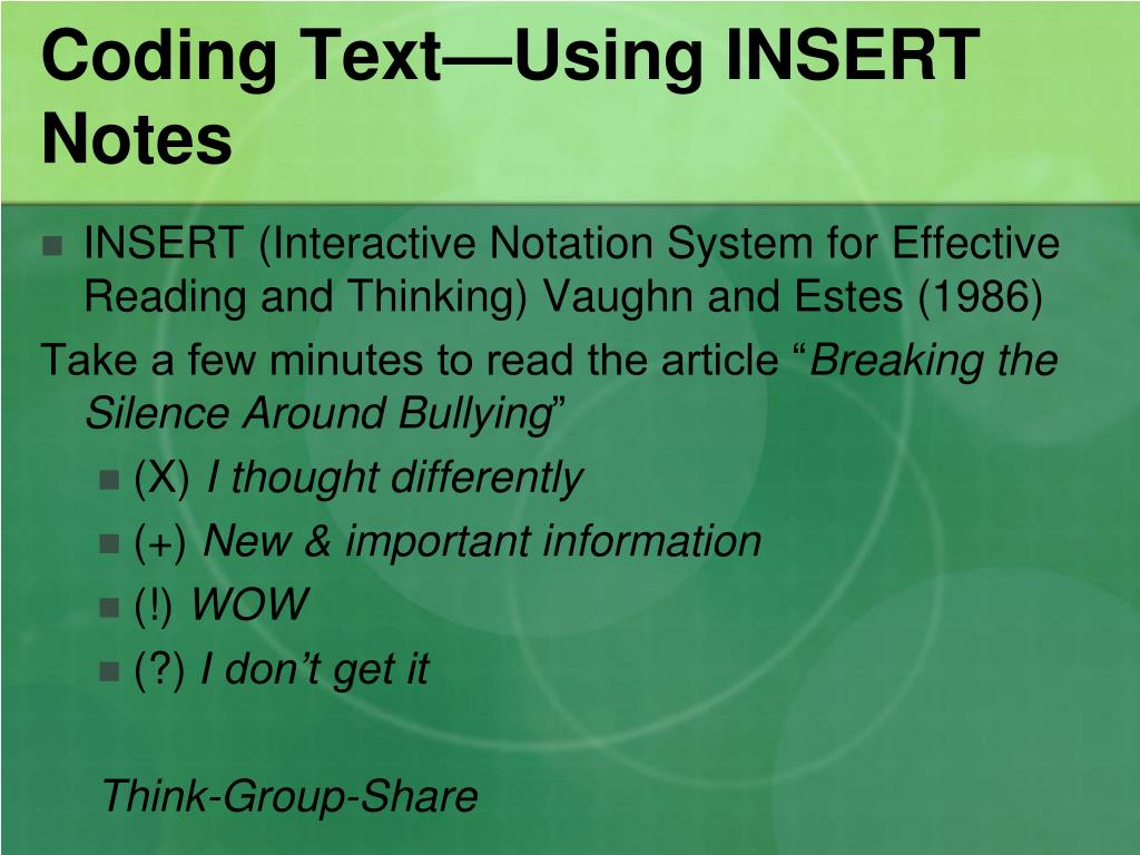 Coding Text—Using INSERT Notes • INSERT (Interactive Notation System for Effective Reading and Thinking) Vaughn and Estes (1986) Take a few minutes to read the article “Breaking the Silence Around Bullying” • (X) I thought differently • (+) New & important information • (!) WOW • (?) I don’t get it Think-Group-Share