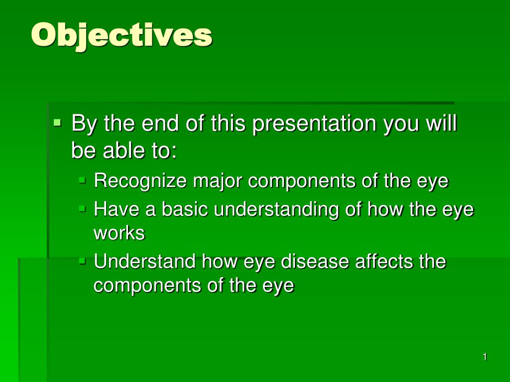 Objectives • By the end of this presentation you will be able to: • Recognize major components of the eye • Have a basic understanding of how the eye works • Understand how eye disease affects the components of the eye