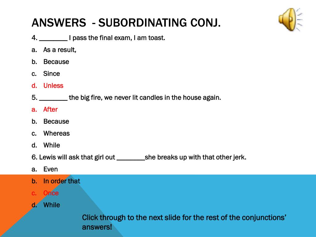Answers - subordinating conj. • 4. ________ I pass the final exam, I am toast. • As a result, • Because • Since • Unless • 5. ________ the big fire, we never lit candles in the house again. • After • Because • Whereas • While • 6. Lewis will ask that girl out ________she breaks up with that other jerk. • Even • In order that • Once • While Click through to the next slide for the rest of the conjunctions’ answers!