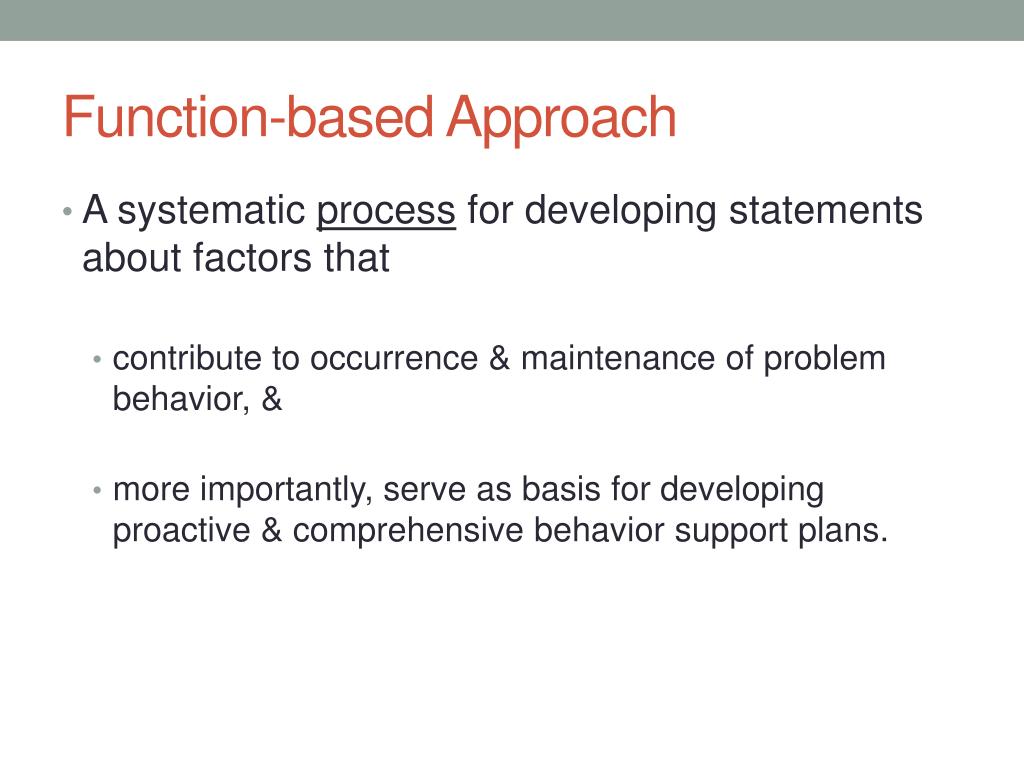 Function-based Approach • A systematic process for developing statements about factors that • contribute to occurrence & maintenance of problem behavior, & • more importantly, serve as basis for developing proactive & comprehensive behavior support plans.