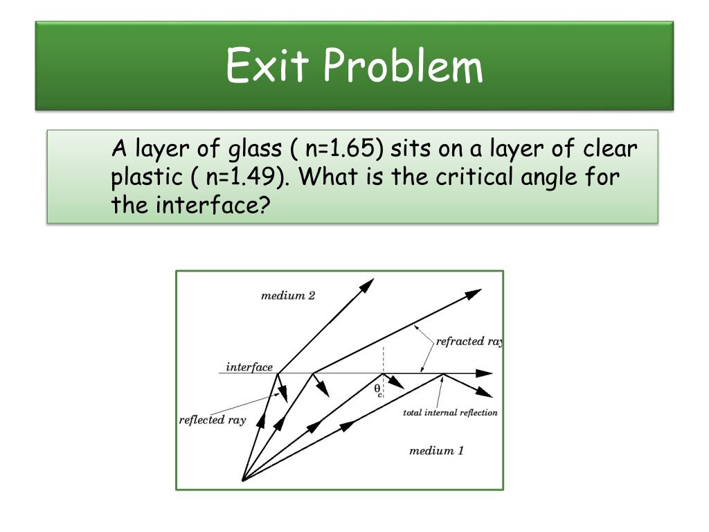 Exit Problem A layer of glass ( n=1.65) sits on a layer of clear plastic ( n=1.49). What is the critical angle for the interface?