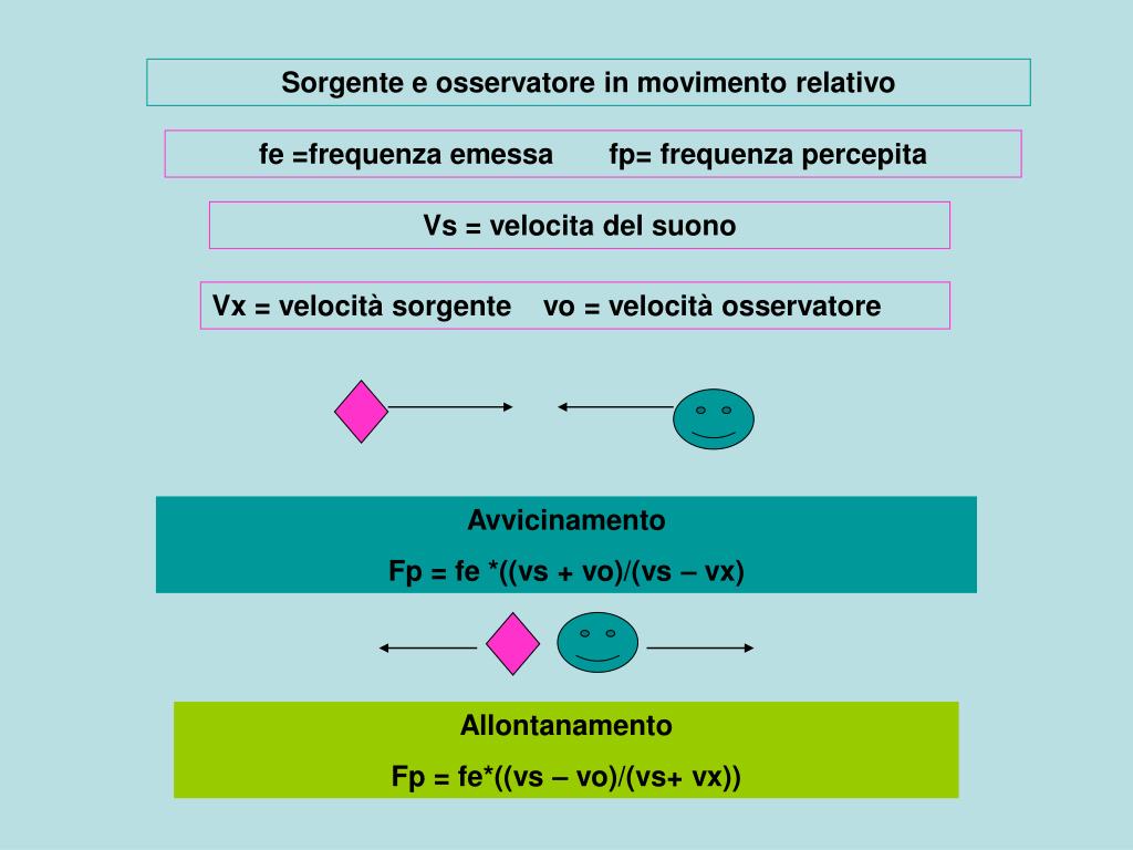 Sorgente e osservatore in movimento relativo fe =frequenza emessa fp= frequenza percepita Vs = velocita del suono Vx = velocità sorgente vo = velocità osservatore Avvicinamento Fp = fe *((vs + vo)/(vs – vx) Allontanamento Fp = fe*((vs – vo)/(vs+ vx))