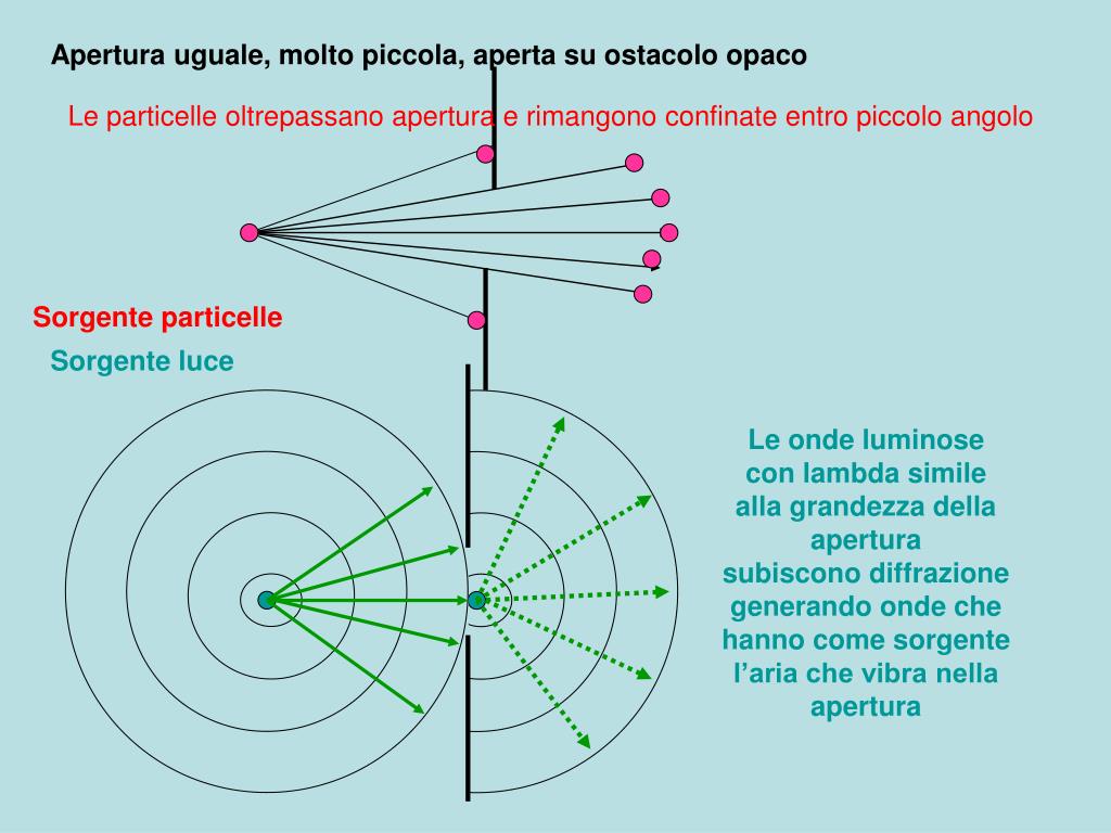 Apertura uguale, molto piccola, aperta su ostacolo opaco Le particelle oltrepassano apertura e rimangono confinate entro piccolo angolo Sorgente particelle Sorgente luce Le onde luminosecon lambda similealla grandezza della aperturasubiscono diffrazionegenerando onde chehanno come sorgentel’aria che vibra nellaapertura