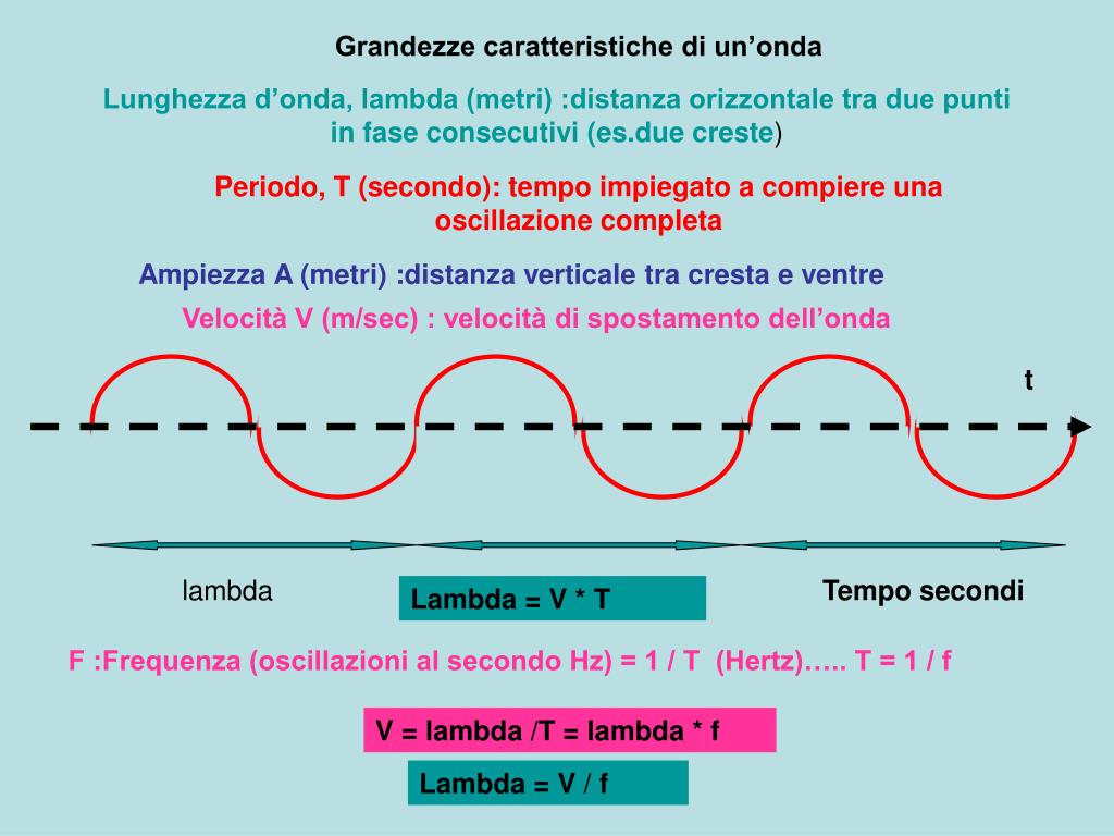 Grandezze caratteristiche di un’onda Lunghezza d’onda, lambda (metri) :distanza orizzontale tra due puntiin fase consecutivi (es.due creste) Periodo, T (secondo): tempo impiegato a compiere unaoscillazione completa Ampiezza A (metri) :distanza verticale tra cresta e ventre Velocità V (m/sec) : velocità di spostamento dell’onda t lambda Tempo secondi Lambda = V * T F :Frequenza (oscillazioni al secondo Hz) = 1 / T (Hertz)….. T = 1 / f V = lambda /T = lambda * f Lambda = V / f