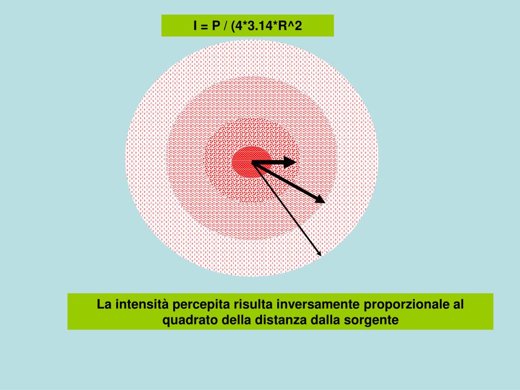 I = P / (4*3.14*R^2 La intensità percepita risulta inversamente proporzionale al quadrato della distanza dalla sorgente