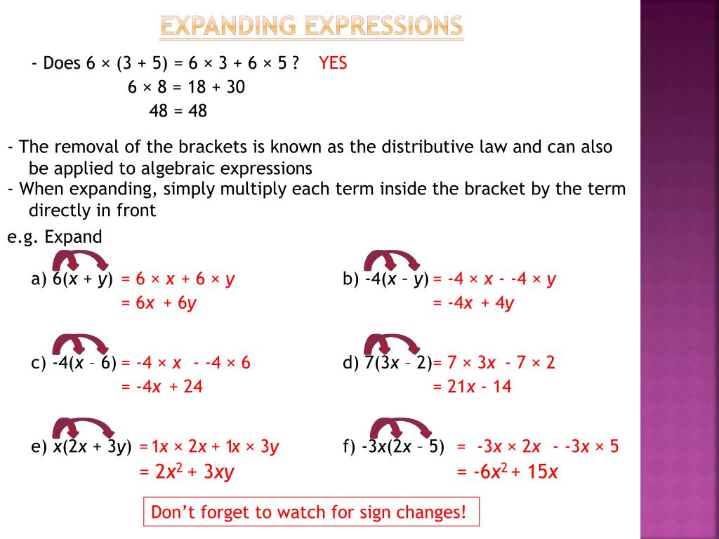 Expanding expressions • - Does 6 × (3 + 5) = 6 × 3 + 6 × 5 ? • YES • 6 × 8 = 18 + 30 • 48 = 48 • - The removal of the brackets is known as the distributive law and can also be applied to algebraic expressions • - When expanding, simply multiply each term inside the bracket by the term directly in front • e.g. Expand • a) 6(x + y) = 6 × x + 6 × y • b) -4(x – y) = -4 × x - -4 × y = 6x + 6y = -4x + 4y • c) -4(x – 6) = -4 × x - -4 × 6 • d) 7(3x – 2) = 7 × 3x - 7 × 2 = -4x + 24 = 21x - 14 • e) x(2x + 3y) = x × 2x 1 1 + x × 3y • f) -3x(2x – 5) = -3x × 2x - -3x × 5 = 2x2 + 3xy = -6x2 + 15x Don’t forget to watch for sign changes!