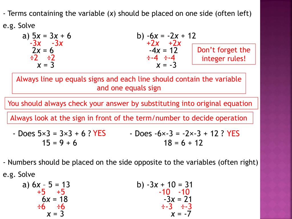 - Terms containing the variable (x) should be placed on one side (often left) • e.g. Solve a) 5x =3x + 6 b) -6x = -2x + 12 -3x -3x +2x +2x 2x = 6 -4x = 12 Don’t forget the integer rules! ÷2 ÷2 ÷-4 ÷-4 x = 3 x = -3 Always line up equals signs and each line should contain the variable and one equals sign You should always check your answer by substituting into original equation Always look at the sign in front of the term/number to decide operation • YES - Does 5×3 = 3×3 + 6 ? - Does -6×-3 = -2×-3 + 12 ? • YES 15 = 9 + 6 18 = 6 + 12 • - Numbers should be placed on the side opposite to the variables (often right) • e.g. Solve a) 6x – 5 =13 b) -3x + 10= 31 +5 +5 -10 -10 6x = 18 -3x = 21 ÷6 ÷6 ÷-3 ÷-3 x = 3 x = -7
