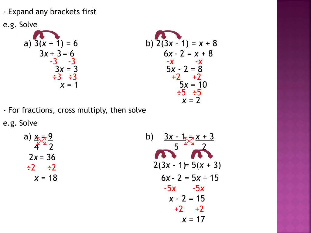 - Expand any brackets first • e.g. Solve a) 3(x + 1) = 6 b) 2(3x – 1) = x + 8 3x + 3 = 6 6x - 2 = x + 8 -3 -3 -x -x 3x = 3 5x - 2= 8 ÷3 ÷3 +2 +2 x = 1 5x = 10 ÷5 ÷5 x = 2 • - For fractions, cross multiply, then solve • e.g. Solve a) x = 9 4 2 b) 3x - 1 = x + 3 5 2 2x = 36 2(3x - 1) = 5(x + 3) ÷2 ÷2 x = 18 6x - 2 = 5x + 15 -5x -5x x - 2= 15 +2 +2 x = 17