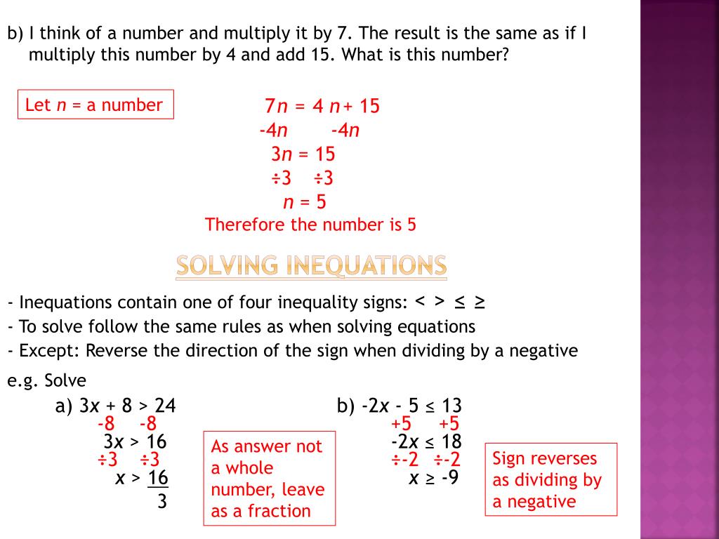b) I think of a number and multiply it by 7. The result is the same as if I multiply this number by 4 and add 15. What is this number? Let n = a number 7 n = n 4 + 15 -4n -4n 3n = 15 ÷3 ÷3 n = 5 Therefore the number is 5 Solving inequations • - Inequations contain one of four inequality signs: < > ≤ ≥ • - To solve follow the same rules as when solving equations • - Except: Reverse the direction of the sign when dividing by a negative • e.g. Solve a) 3x + 8 >24 b) -2x -5 ≤ 13 -8 -8 +5 +5 3x >16 -2x ≤ 18 As answer not a whole number, leave as a fraction ÷3 ÷3 ÷-2 ÷-2 Sign reverses as dividing by a negative x >16 3 x ≥ -9