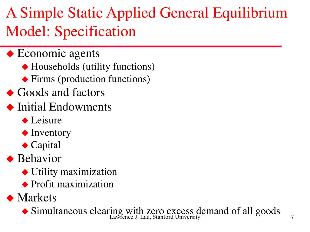 A Simple Static Applied General Equilibrium Model: Specification • Economic agents • Households (utility functions) • Firms (production functions) • Goods and factors • Initial Endowments • Leisure • Inventory • Capital • Behavior • Utility maximization • Profit maximization • Markets • Simultaneous clearing with zero excess demand of all goods Lawrence J. Lau, Stanford University