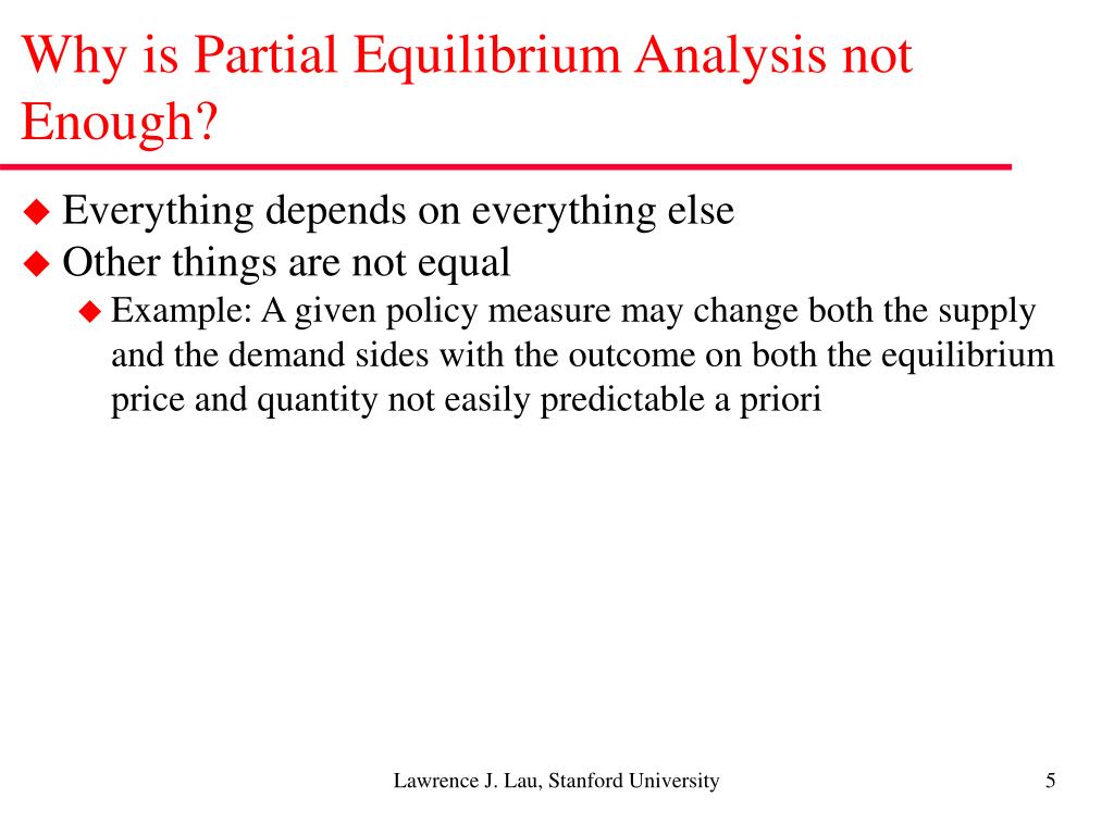 Why is Partial Equilibrium Analysis not Enough? • Everything depends on everything else • Other things are not equal • Example: A given policy measure may change both the supply and the demand sides with the outcome on both the equilibrium price and quantity not easily predictable a priori Lawrence J. Lau, Stanford University