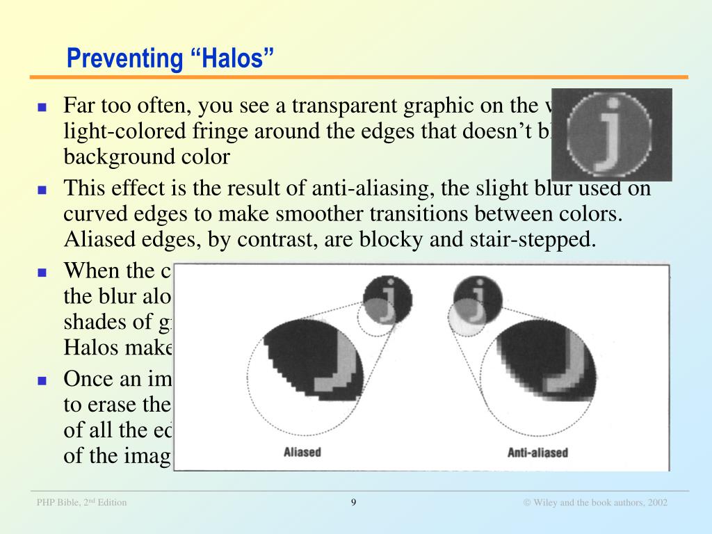 Preventing “Halos” • Far too often, you see a transparent graphic on the web with light-colored fringe around the edges that doesn’t blend into the background color • This effect is the result of anti-aliasing, the slight blur used on curved edges to make smoother transitions between colors. Aliased edges, by contrast, are blocky and stair-stepped. • When the color around an anti-aliased edge is made transparent, the blur along the edge remains intact, and you can see all those shades of gray between the graphic and the darker background. Halos make graphics look messy and unprofessional • Once an image is saved as a GIF, the only way to fix the halo is to erase the anti-aliased edge, pixel by pixel. Even if you get rid of all the edges, you’ll be left with blocky edges and the quality of the image will suffer