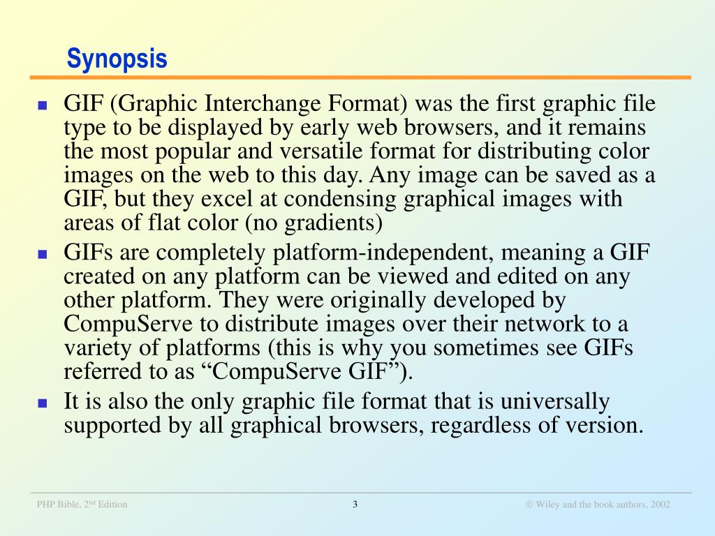 Synopsis • GIF (Graphic Interchange Format) was the first graphic file type to be displayed by early web browsers, and it remains the most popular and versatile format for distributing color images on the web to this day. Any image can be saved as a GIF, but they excel at condensing graphical images with areas of flat color (no gradients) • GIFs are completely platform-independent, meaning a GIF created on any platform can be viewed and edited on any other platform. They were originally developed by CompuServe to distribute images over their network to a variety of platforms (this is why you sometimes see GIFs referred to as “CompuServe GIF”). • It is also the only graphic file format that is universally supported by all graphical browsers, regardless of version.