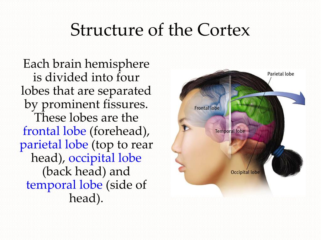 Structure of the Cortex Each brain hemisphere is divided into four lobes that are separated by prominent fissures. These lobes are the frontal lobe (forehead), parietal lobe (top to rear head), occipital lobe (back head) and temporal lobe (side of head).