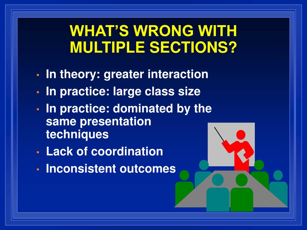 WHAT’S WRONG WITH MULTIPLE SECTIONS? • In theory: greater interaction • In practice: large class size • In practice: dominated by the same presentation techniques • Lack of coordination • Inconsistent outcomes