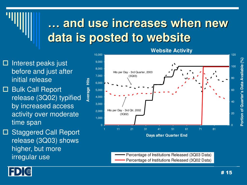 … and use increases when new data is posted to website • Interest peaks just before and just after initial release • Bulk Call Report release (3Q02) typified by increased access activity over moderate time span • Staggered Call Report release (3Q03) shows higher, but more irregular use