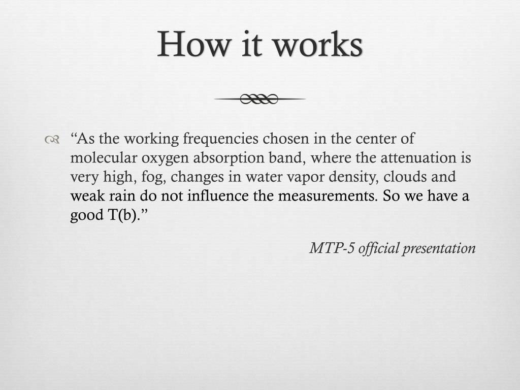 How it works • “As the working frequencies chosen in the center of molecular oxygen absorption band, where the attenuation is very high, fog, changes in water vapor density, clouds and weak rain do not influence the measurements. So we have a good T(b).” MTP-5 official presentation