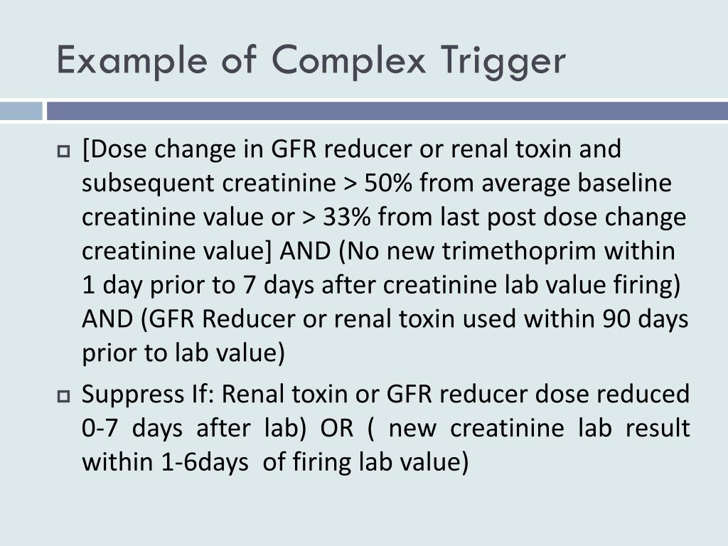Example of Complex Trigger • [Dose change in GFR reducer or renal toxin and subsequent creatinine > 50% from average baseline creatinine value or > 33% from last post dose change creatinine value] AND (No new trimethoprim within 1 day prior to 7 days after creatinine lab value firing) AND (GFR Reducer or renal toxin used within 90 days prior to lab value) • Suppress If: Renal toxin or GFR reducer dose reduced 0-7 days after lab) OR ( new creatinine lab result within 1-6days of firing lab value)